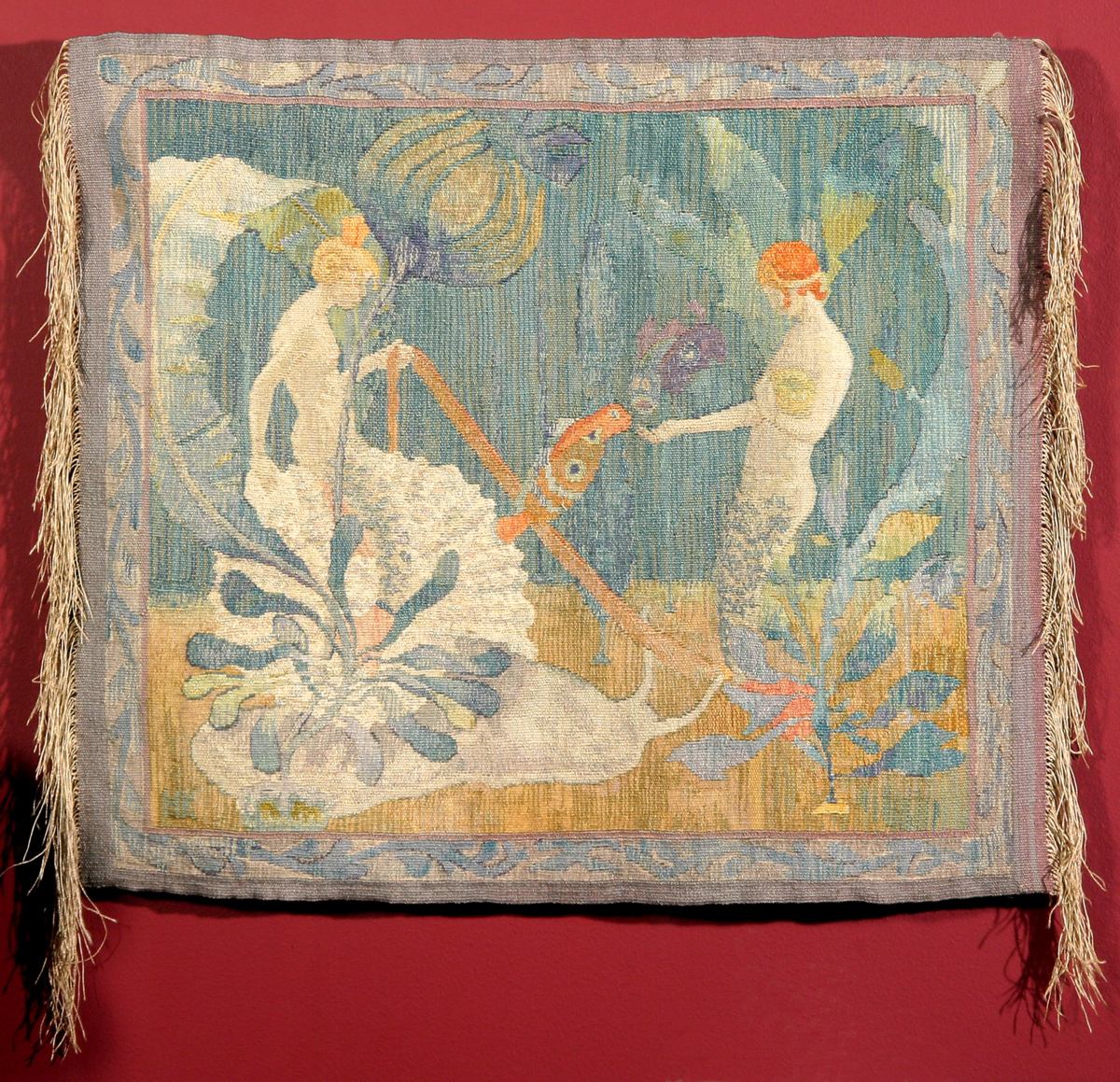 Tapestry with linen warp and some wool of varying quality. The base colours are blue and golden-brown, while the pattern is mainly green, white and grey, with some red. The motif is a sea with two mythical creatures in the National Romantic style.