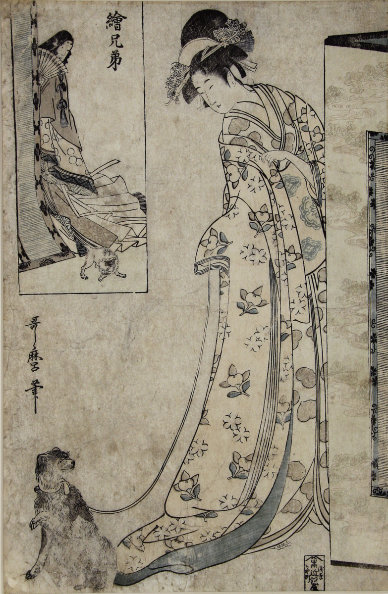 Träsnitt föreställande en stående kvinna med hund. I övre vänstra hörnet syns en liknande bild.