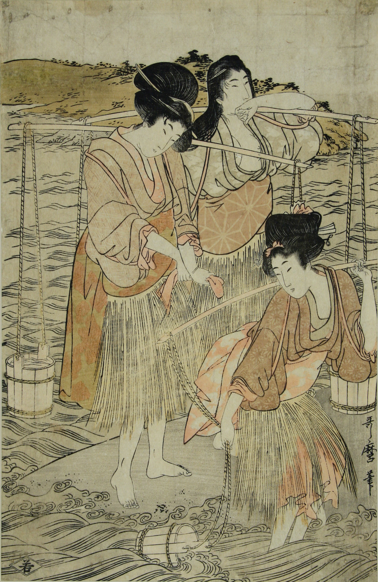 Triptyk föreställande kvinnor som hämtar vatten i floden.