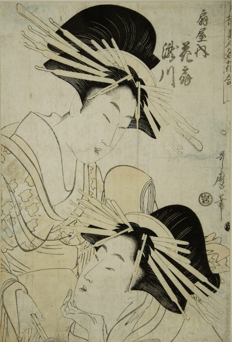 Träsnitt föreställande två kurtisaner.