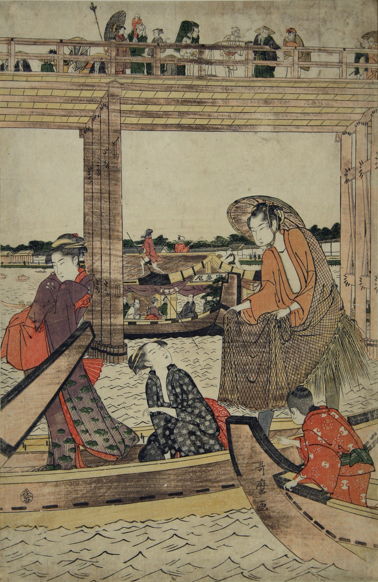 Träsnitt föreställande sällskap i båtar under Ryogokubron.