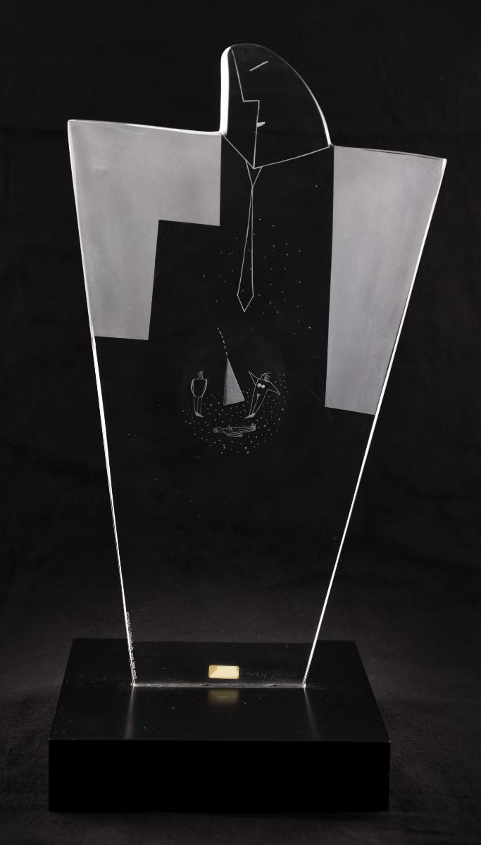 Skupltur i form av en mansfigur monterad på svart träsockel.
