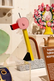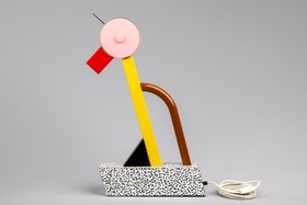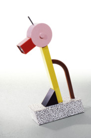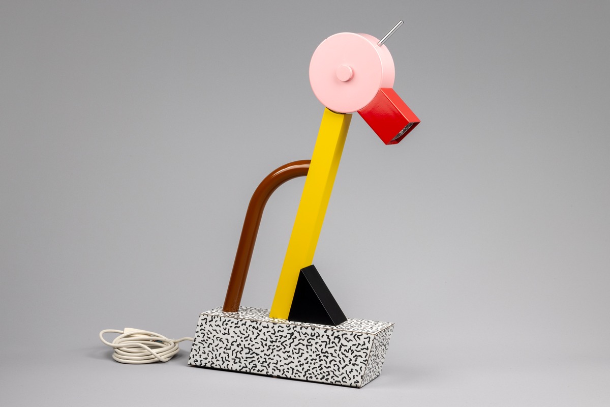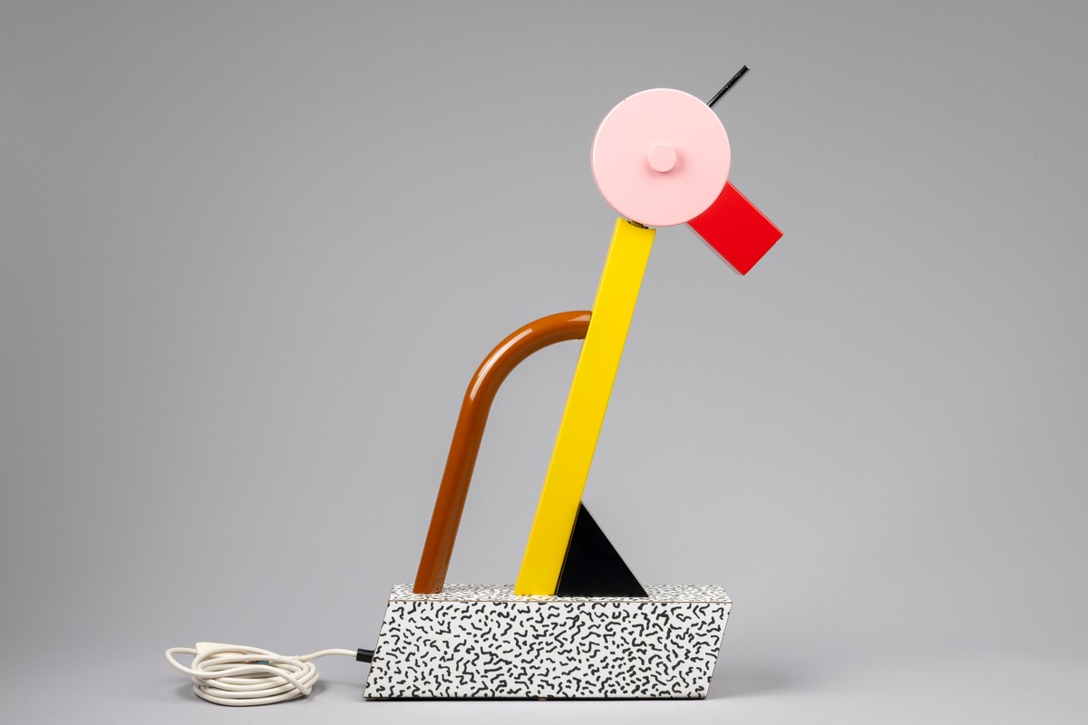 Bordslampan är tillverkad av metall, trä och plastlaminat. Formgivaren Ettore Sottsass var grundare av den italienska Memphisgruppen som var verksam under 1980-talet.