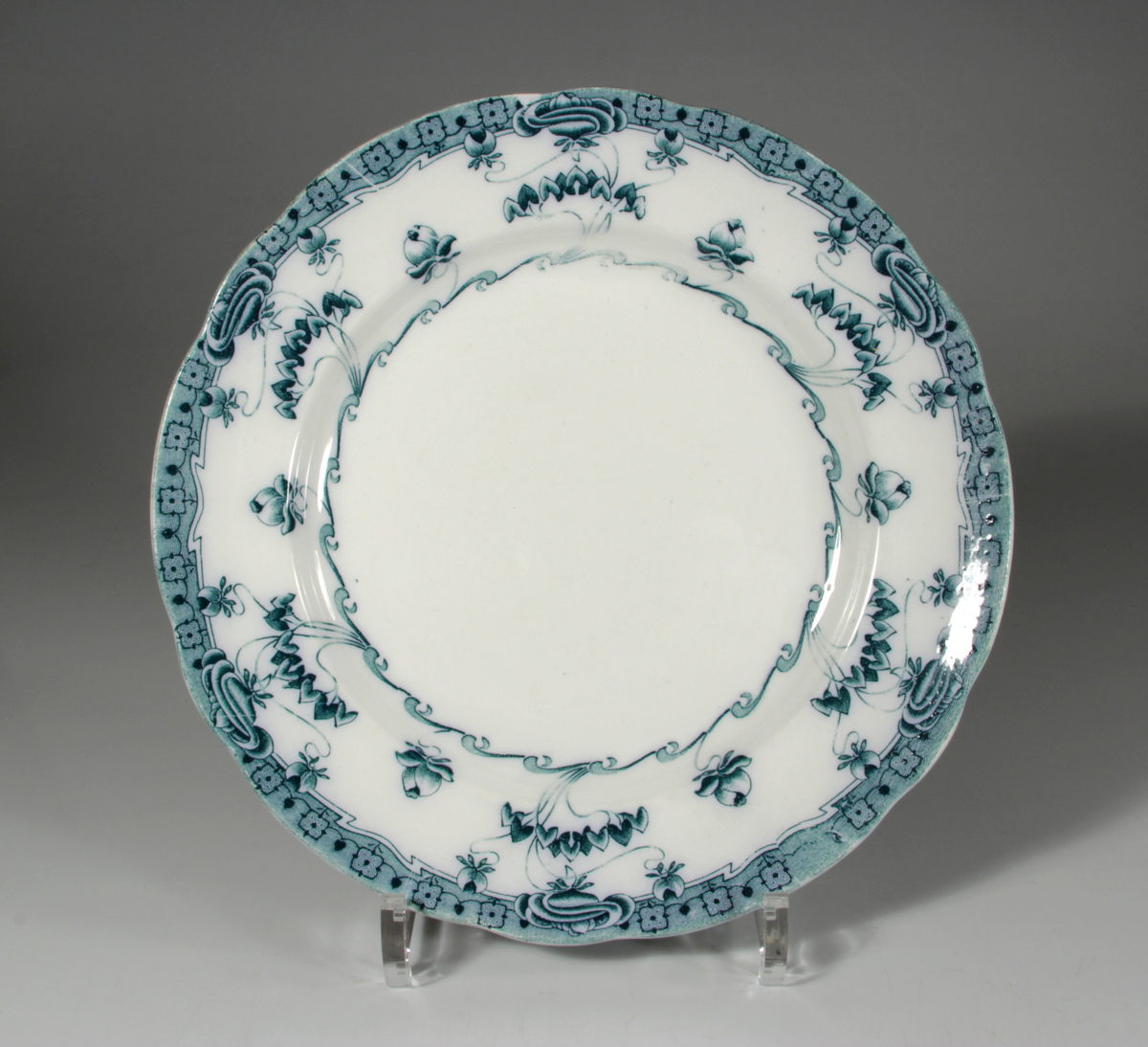Mattallrik i flintgods med koppartryckt dekor föreställande blommor och blad mellan två bårder.