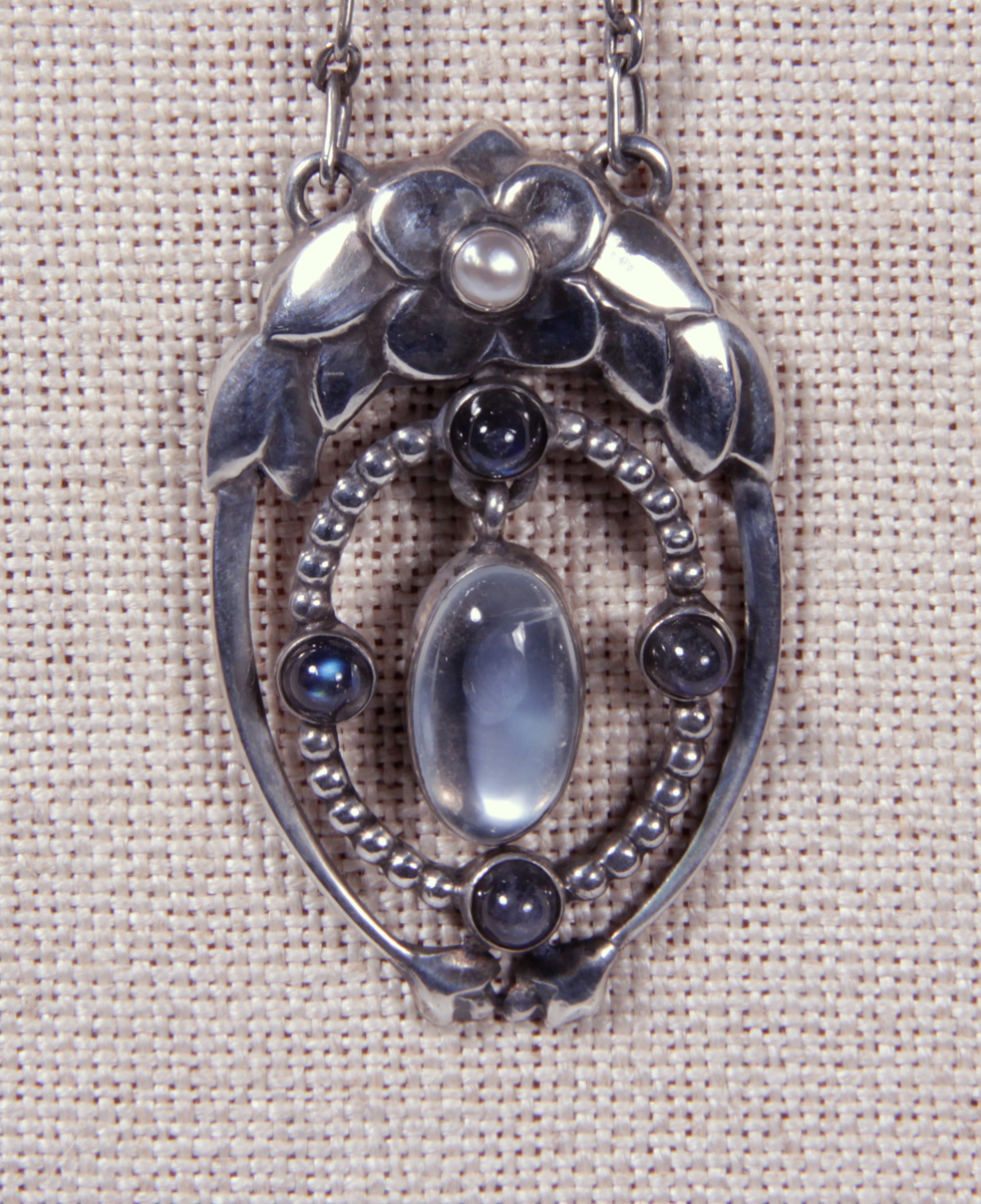 Tillbaka till sökningLägg till i min samlingSkriv utKopiera länkHelbildFöremålHalssmyckeGeorg Jensen (1866 - 1935)Silver med en pärla och stenar1909RKM 637-1909Inköpt från tillverkarenVerket är inte utställtBeskrivningHängsmycke med kedja. Dekorerad med blomornamnet, en pärla, fyra mindre stenar och en större i mitten.