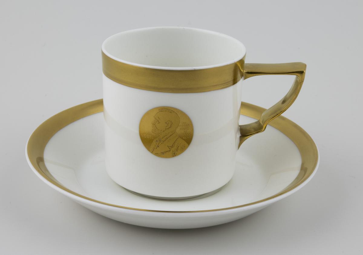 Rak kopp med guldkant, guldöra och Nobel-medaljong i guld. Fat med guldkant. Servisen framtogs till 90-årsjubileet av Nobelprisutdelningen, 1991. Tillsammans med RKM 24-1993, saltkar, är servisen komplett i tio delar.