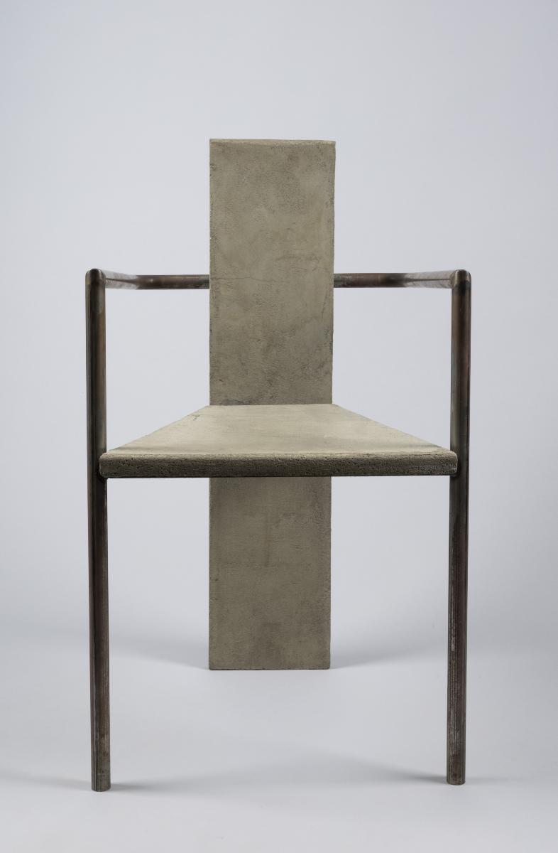 Stol med sits och rygg av betong, ryggen fungerar även som bakre ben. Armstöd och främre ben av stålrör. Stolen av betong har tillverkats i 100 numrerade och signerade exemplar. Finns också i lackerat trä med tillverkning i småserier.