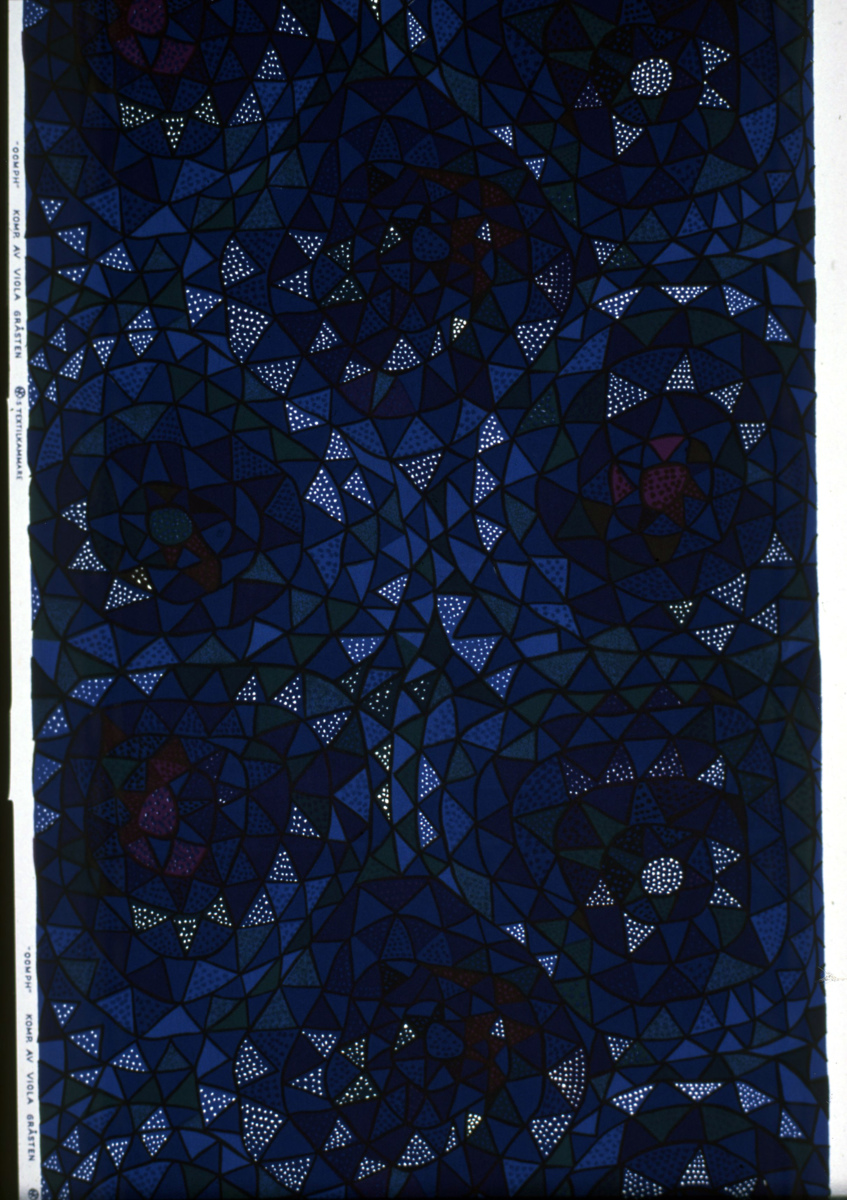 Metervara, bomull i tuskafts bindning, schablontryck. Cirklar uppbygda av trianglar i blå, gröna, violetta och svarta toner med svarta konturer runt om. Vit kant 5cm på var sida.