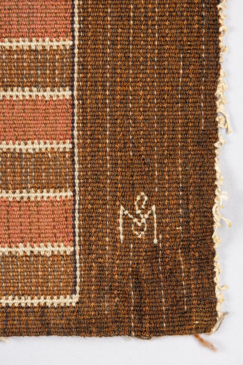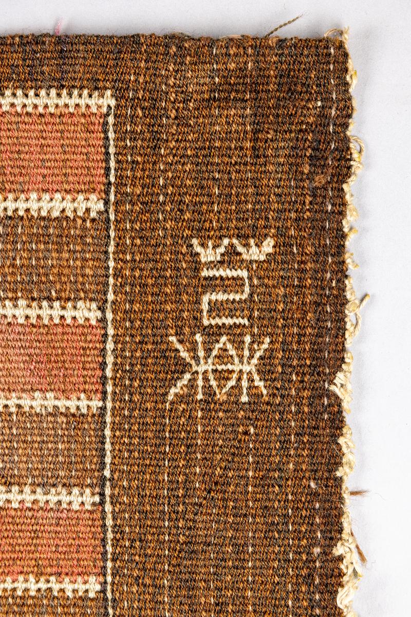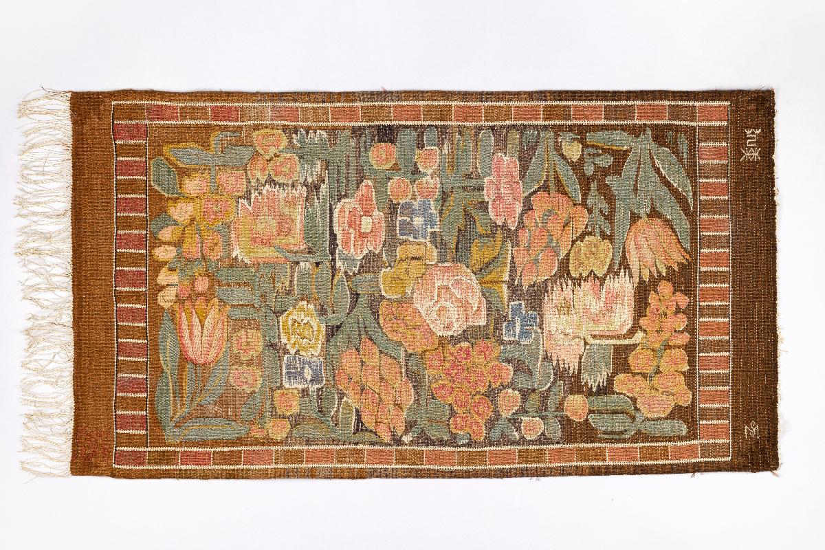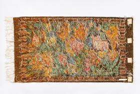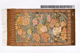 Bänkdyna i gobelängväv. Till varpen har lingarn använts medan inslaget gjorts av ull- och lingarn. Botten färgen är brun medan det florala mönstret övervägande är i rött och grönt.