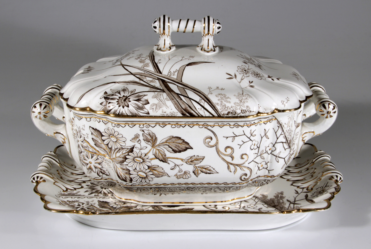 Den rektangulära lockterrinen från serien Peking är tillverkad av opakt flintgods och har en tryckt brun dekor med guld.