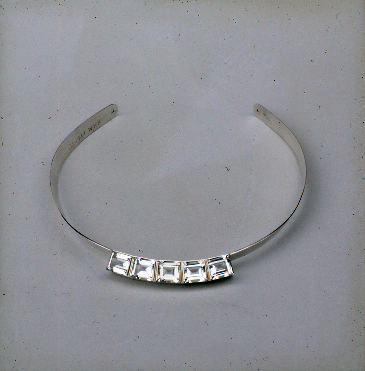 Ett elva cm brett silverband som i vardera ändarna har hål, troligen för sammanhållande band. I mitten utsmyckning med fem fyrkantigt slipade bergkristaller i silverfattning. Diademet komponerat och utfört till Parisutställningen 1937.