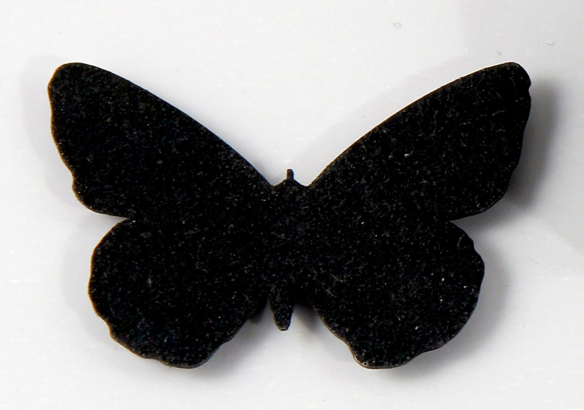 Brosch i form av en fjäril. Tillverkad i oxiderat silver, svart emalj (pulvrig). Broschen har först bränts med ett lager emalj. Därefter har ytan pudrats med emaljpulver, som endast värmts in vilket resulterat i en mattsvart och lätt kornig yta.