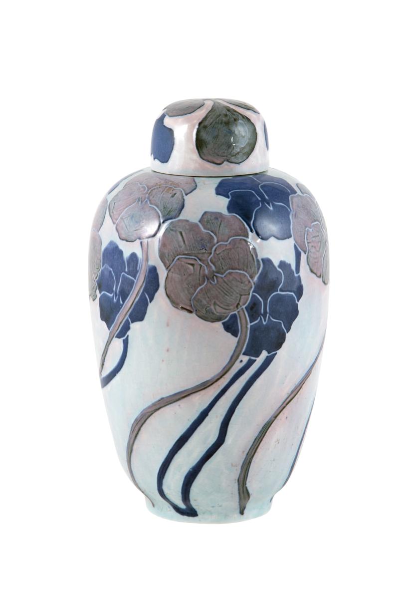 Glaserad flintgods lockurna med dekor i sgraffito teknik med mörkblå penséer mot ljusblå fond.