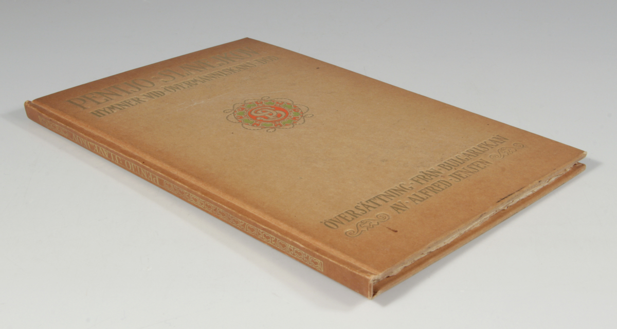 Brunt pappband med färg- och guldtryck. Omsluter Pentjo Slavejkovs Hymner vid övermänniskans död. Översättning från bulgariskan av Alfred Jensen. Tryck och förläggare är Waldemar Zachrissons Boktryckeri AB, Göteborg 1916.