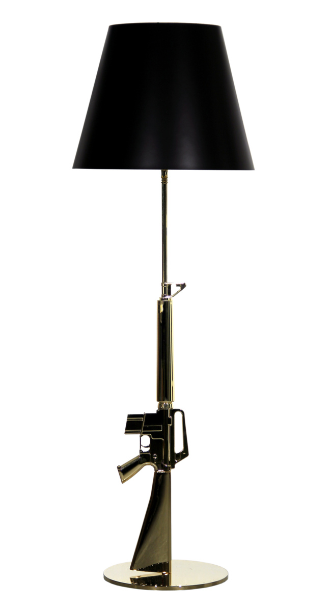 Golvlampa i gjuten aluminium förgylld med 18K guld. Skärm i svart papp med silkscreenad insida i guld.