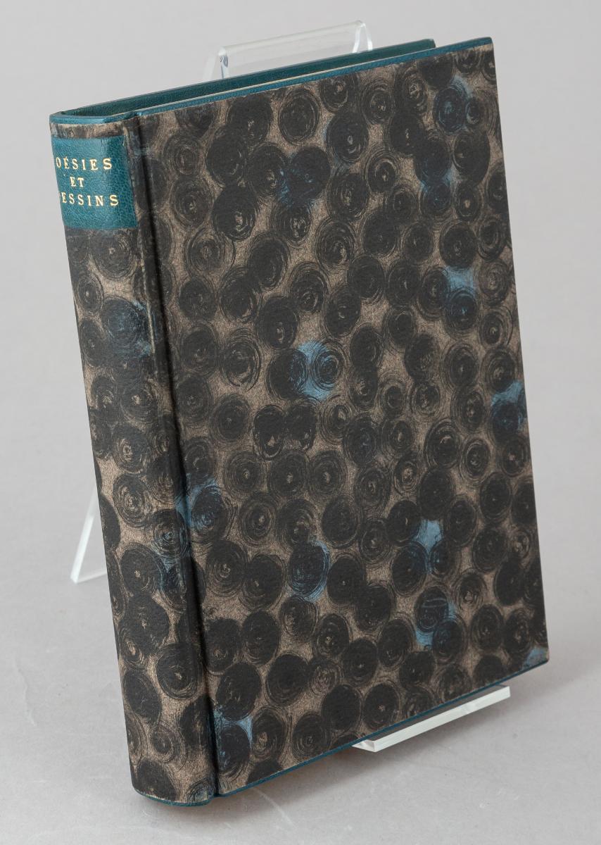 Pappband med kanter skodda med blått skinn. Pärmpapper i brunt med fläckmönster i mörkare brunt och grönblått, komponerat av Margit Izikowitz. Övre guldsnitt. Omsluter: Poésies et. Dessins (antologi), tryckt i Schweiz utan år.
