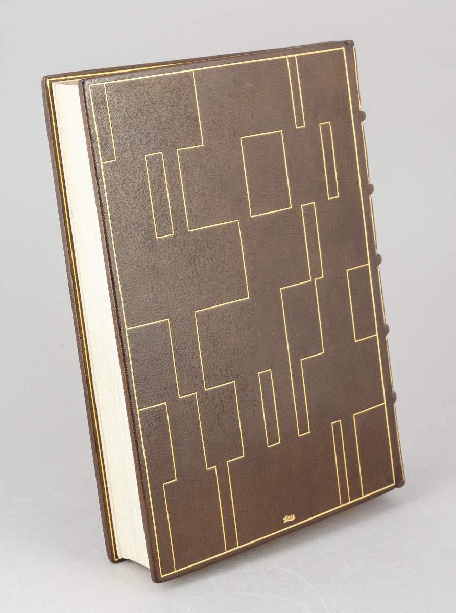 Pappband med brun skinnrygg och bruna skinnkanter. Pärmpapper i brunt med streckornering, komponerat av Niels-Henry Mörck. Övre guldsnitt. Omsluter: Johan Alnander, "Boktryckerikonstens uppkomst och fortgång uti Sverige", Malmö 1959.