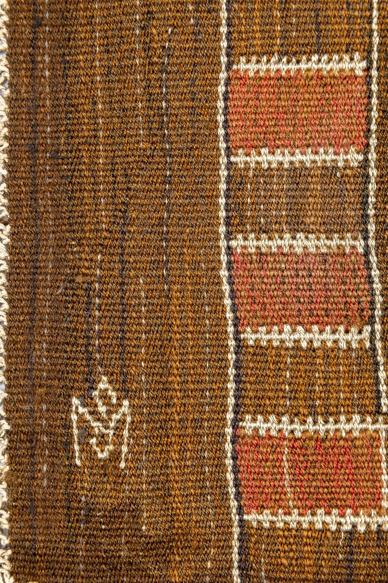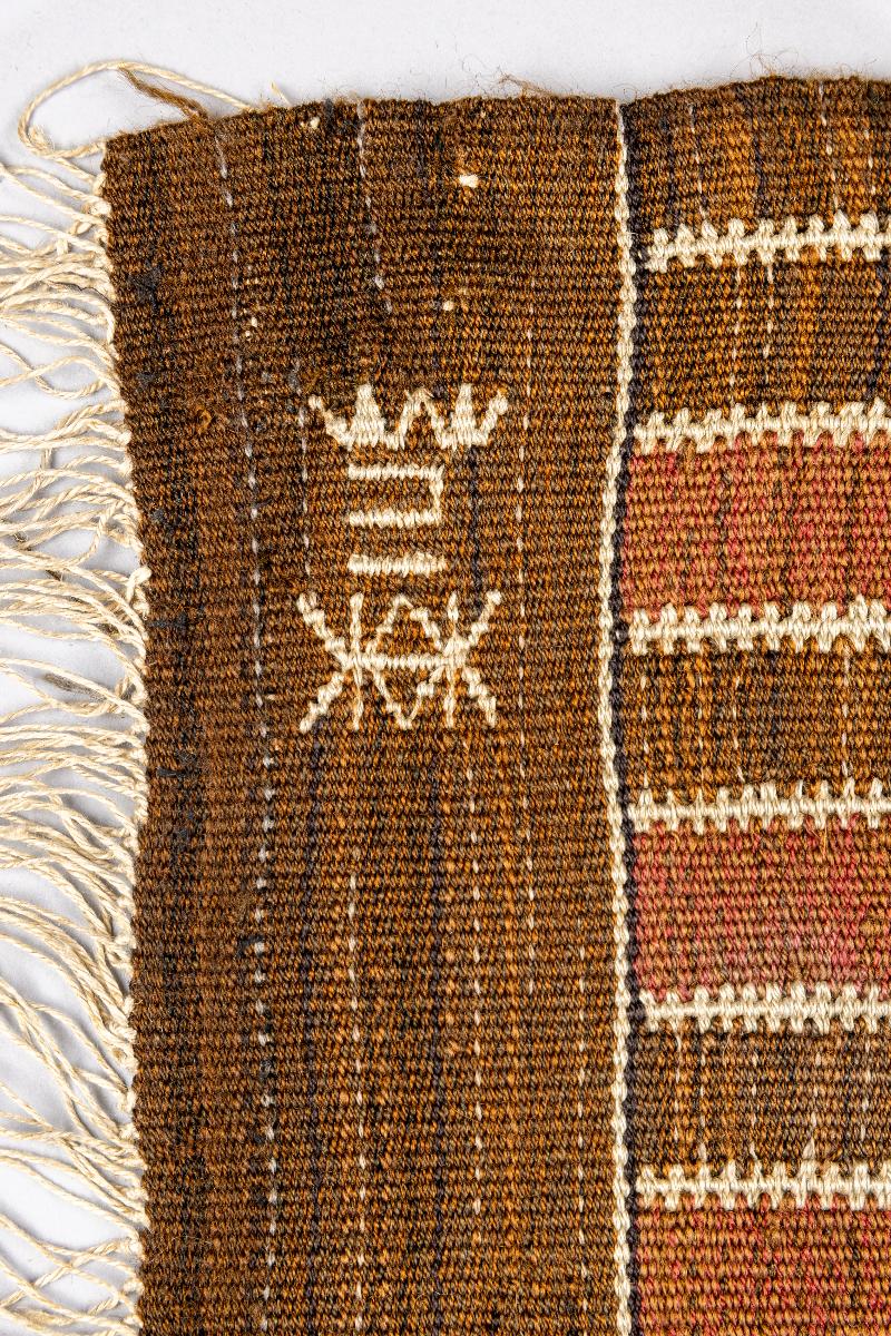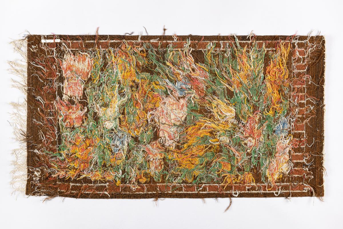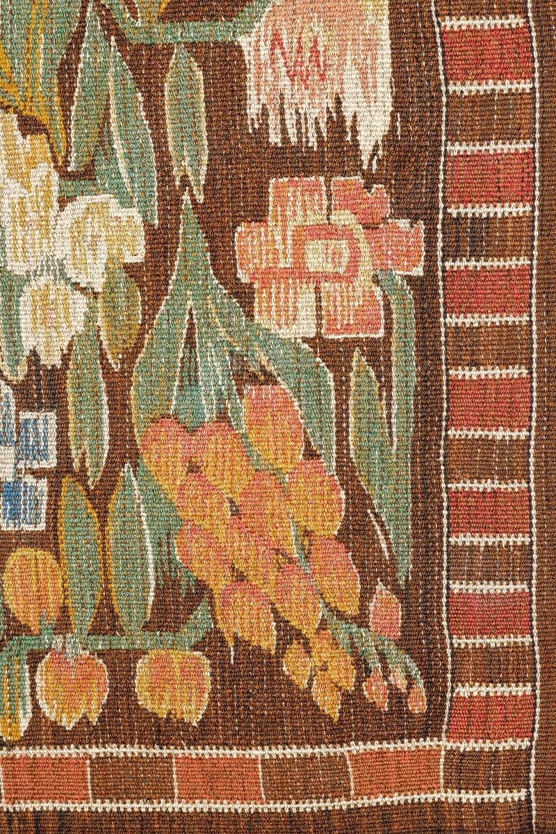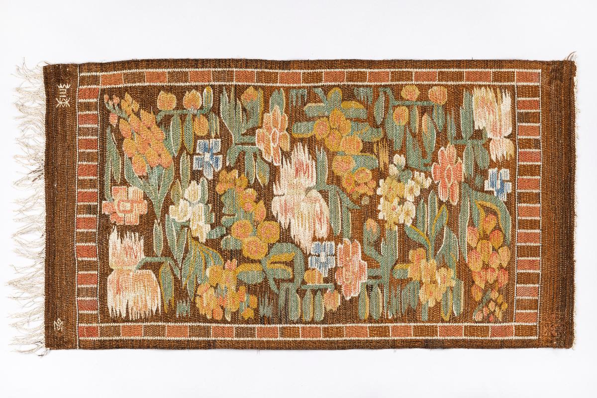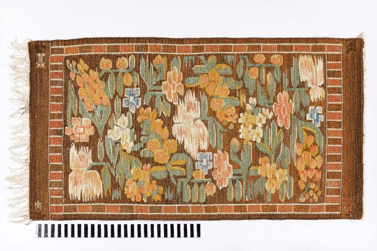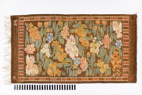 Bänkdyna i gobelängväv. Till varpen har lingarn använts medan inslaget gjorts av ull- och lingarn. Botten färgen är brun medan det florala mönstret övervägande är i rött och blått.