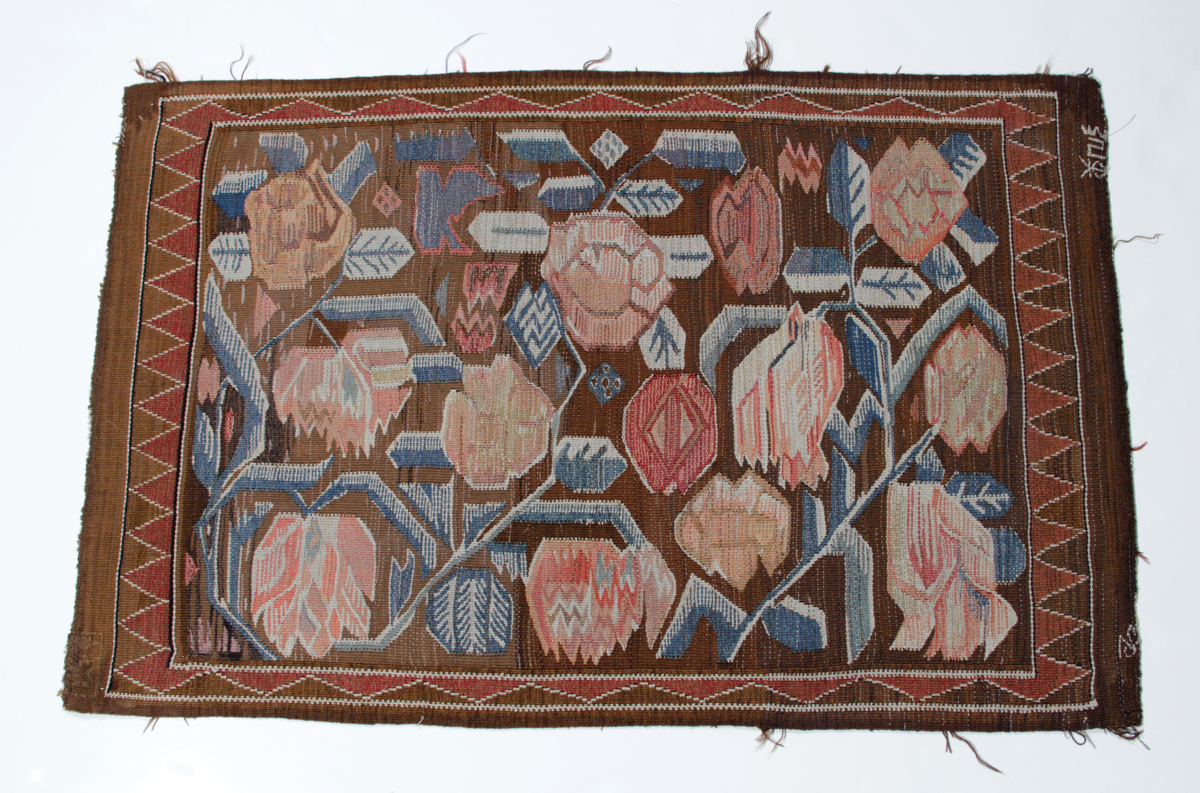 Bänkdyna i gobelängväv. Till varpen har lingarn använts medan inslaget gjorts av ull- och lingarn. Botten färgen är brun medan det florala mönstret övervägande är i rött och blått.