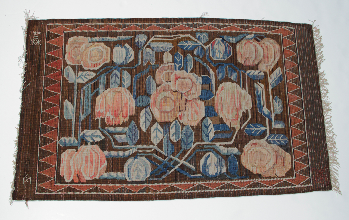 Bänkdyna i gobelängväv. Till varpen har lingarn använts medan inslaget gjorts av ull- och lingarn. Botten färgen är brun medan det florala mönstret övervägande är i rött och blått.