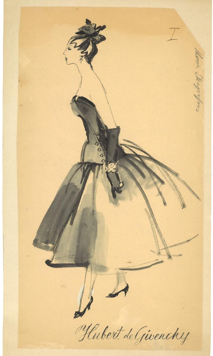 Originalskiss i gråskala på makulaturpapper monterad på kartong med retusch i vit färg. Motivet föreställer en kvinna i vid aftonklänning, handskar och skor med hög klack. Skissen är troligtvis gjord för en annons eller redaktionellt material.