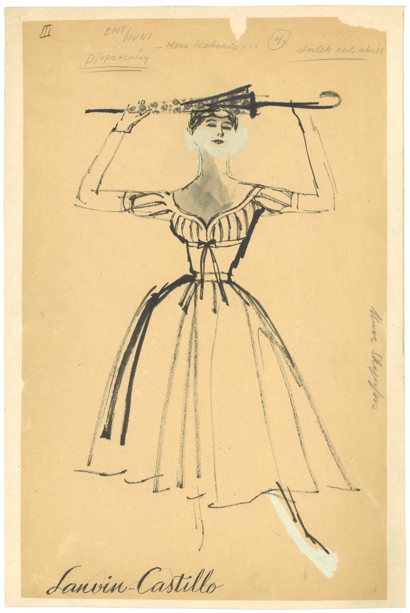 Originalskiss i gråskala på makulaturpapper monterad på kartong med retuscher i ljusgrå färg. Motivet föreställer en kvinna i klänning med vid kjol. Kvinnan håller ett paraply i händerna. Skissen är troligtvis gjord för en annons eller redaktionellt material.
