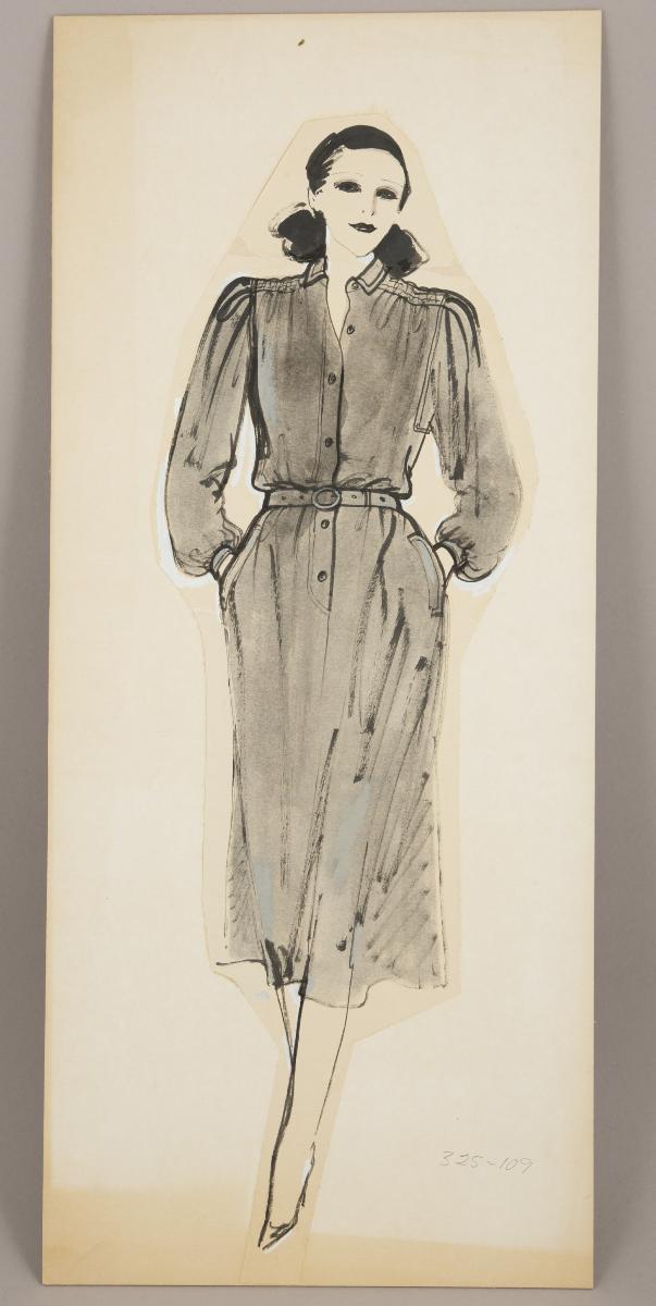 Originalskiss på makulaturpapper monterad på pannå med retusch i vit färg. Motivet i gråskala föreställer en kvinna i klänning som håller sina händer i fickorna. Skissen är troligtvis gjord för en annons eller redaktionellt material.