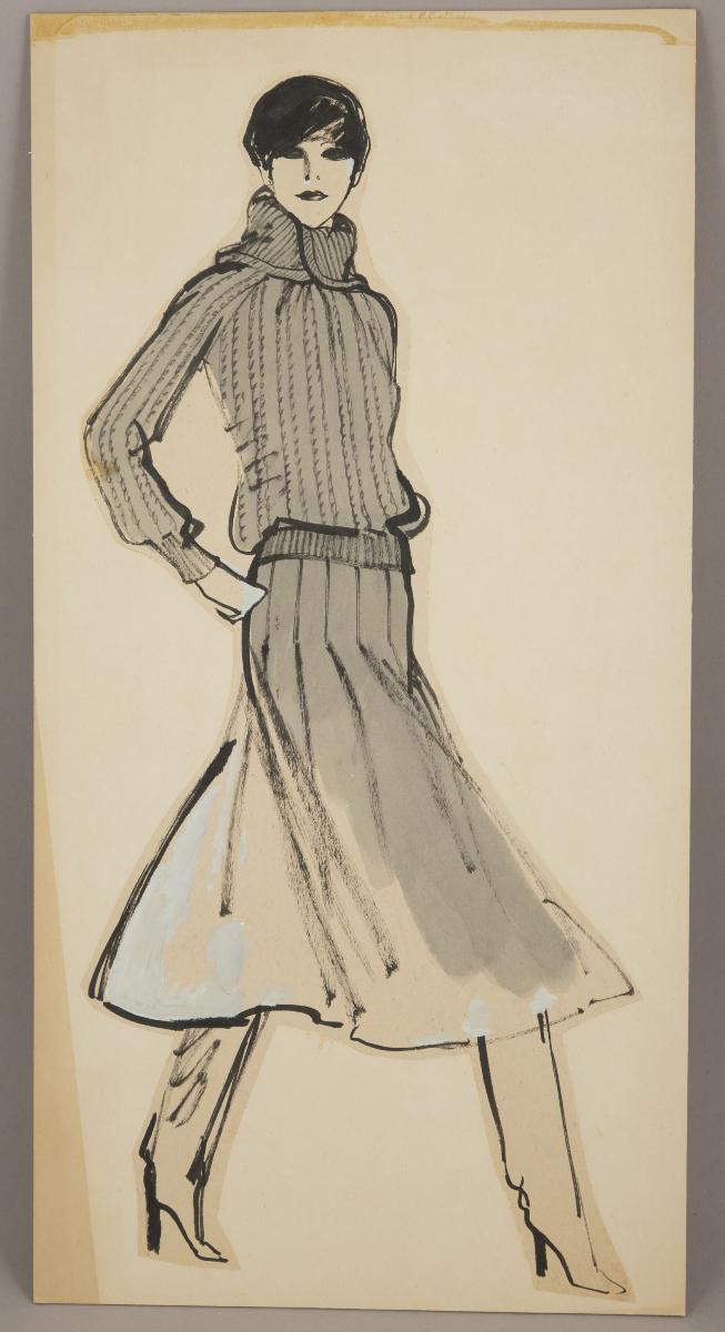 Originalskiss på makulaturpapper monterad på pannå med retusch i vit färg. Motivet i gråskala föreställer en kvinna i kjol och polotröja. Skissen är troligtvis gjord för en annons eller redaktionellt material.