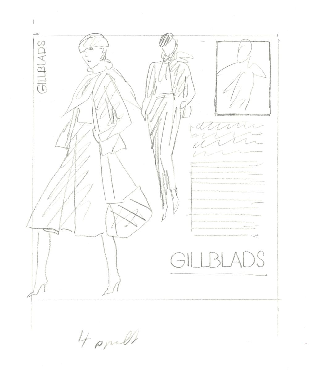 Originalskiss för layout till annons för Gillblads i Göteborg. Annonsen innehåller text, tre illustrationer varav två är kvinnor i helfigur samt Gillblads logotype.