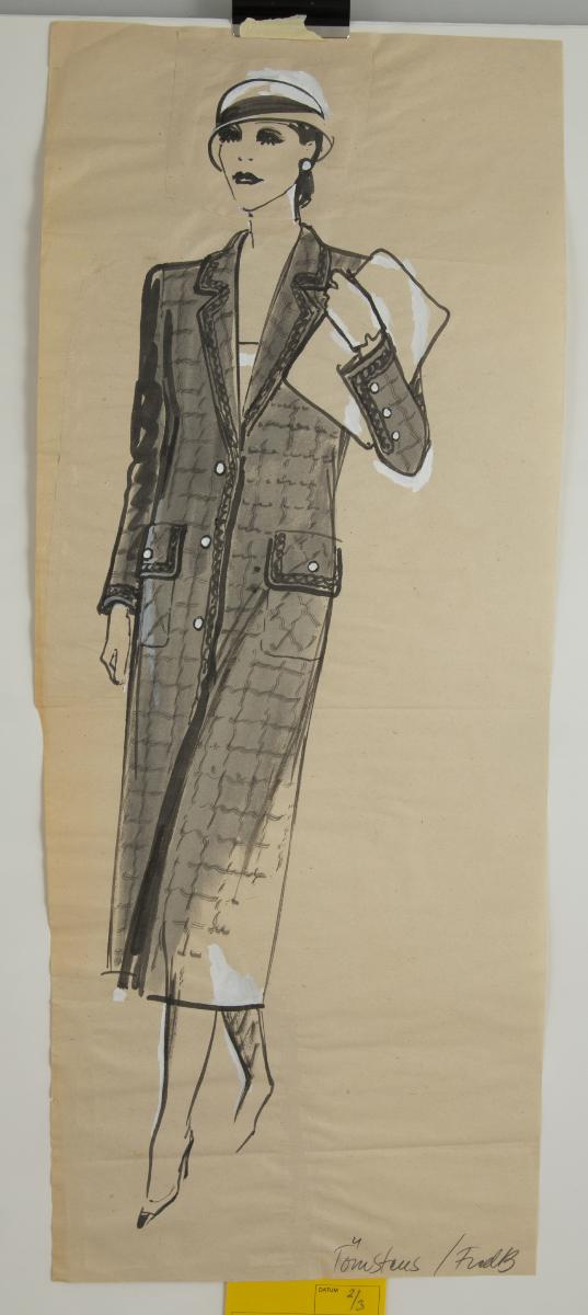 Originalskiss på makulaturpapper med motiv i gråskala och retusch i vit färg. Motivet föreställer en kvinna i helfigur iklädd kappa och hatt. Skissen är sannolikt gjord för butiken Törnstens i Göteborg.