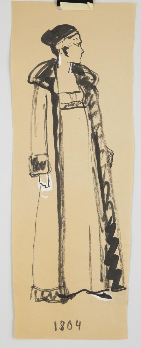 Originalskiss i svart tusch på makulaturpapper med retuscher i vit färg. Motivet föreställer en kvinna i halvprofil klädd i empirskuren klänning och lång kappa. Motivet är daterat: 1804. Har troligtvis använts som bokillustration.