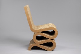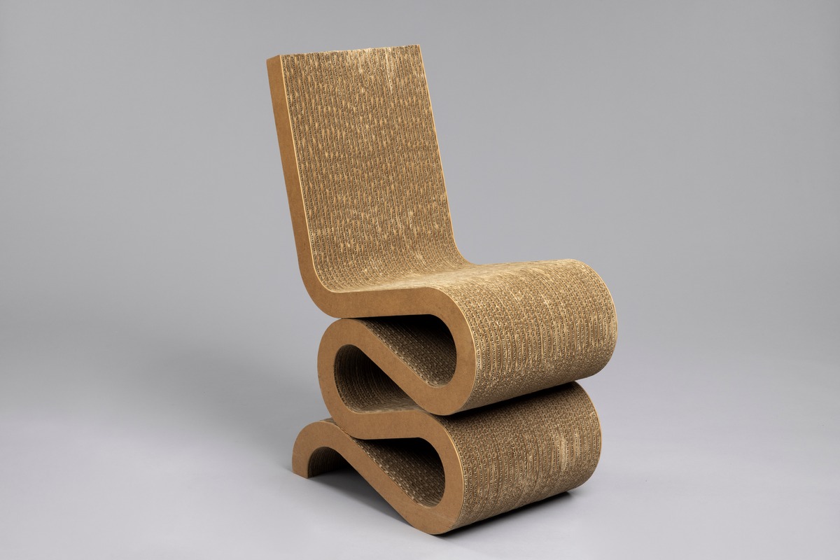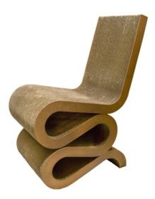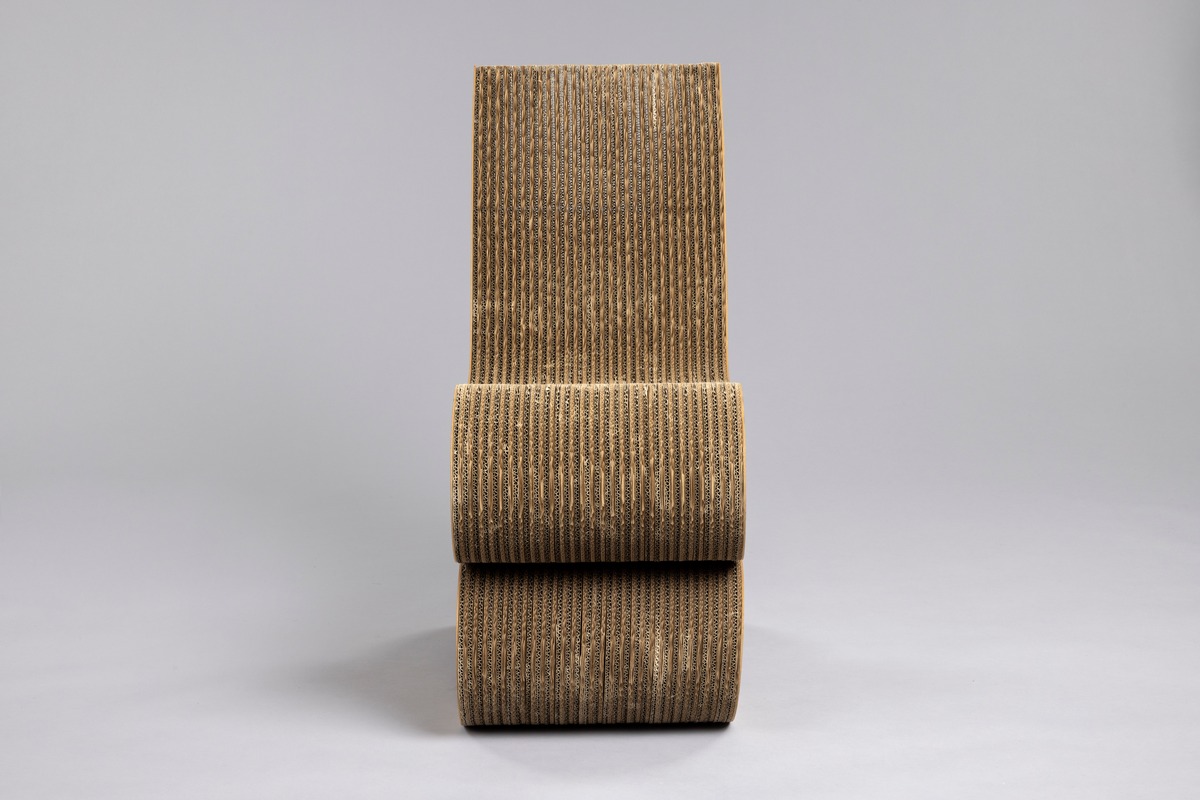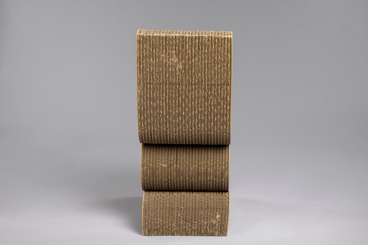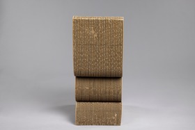 S- formad stol, av korrugerad papp , 60 lager sammanhållna av dolda skruvar