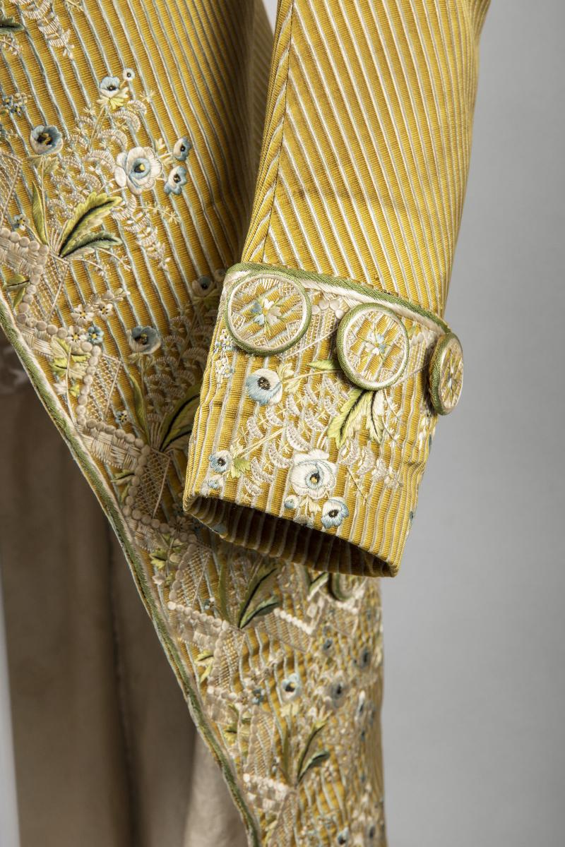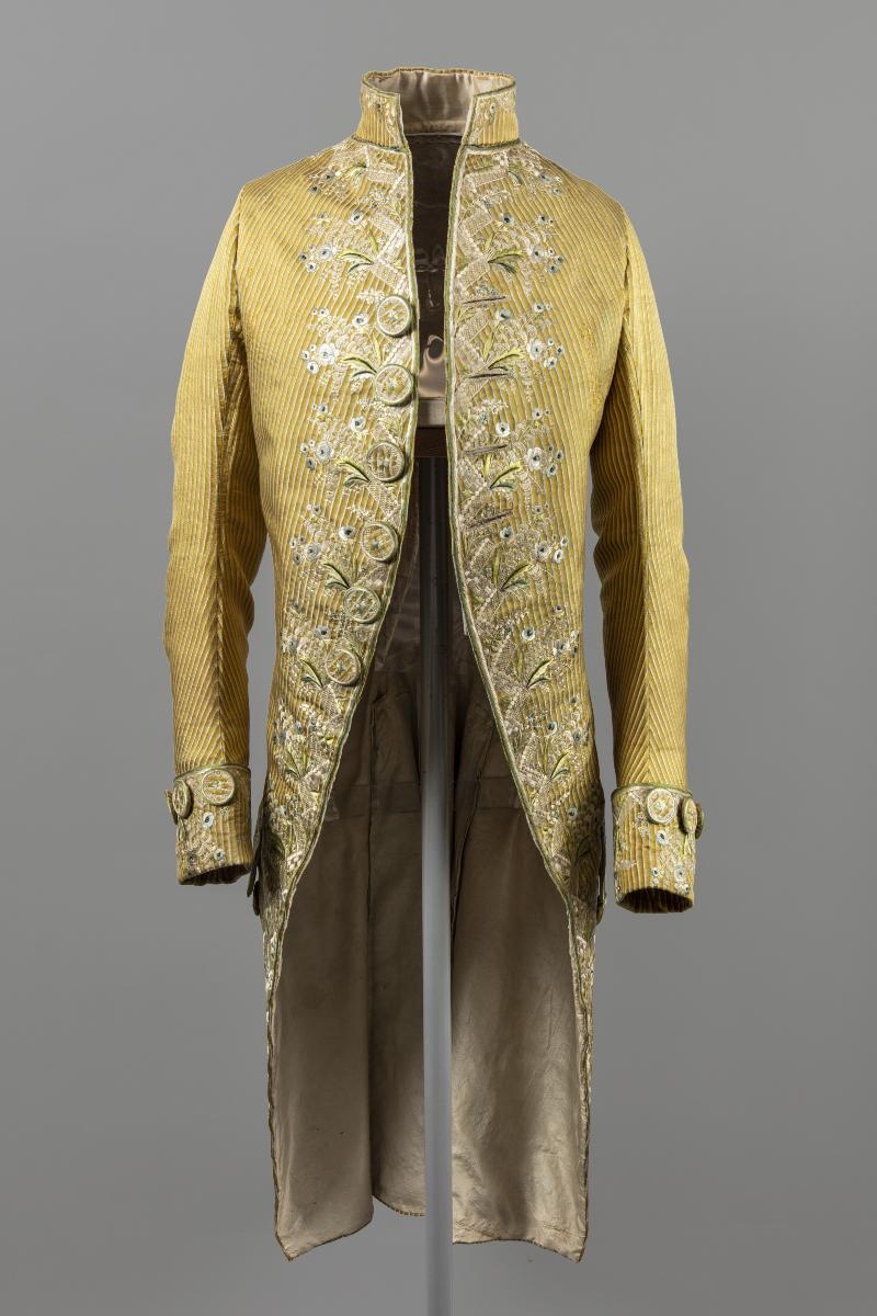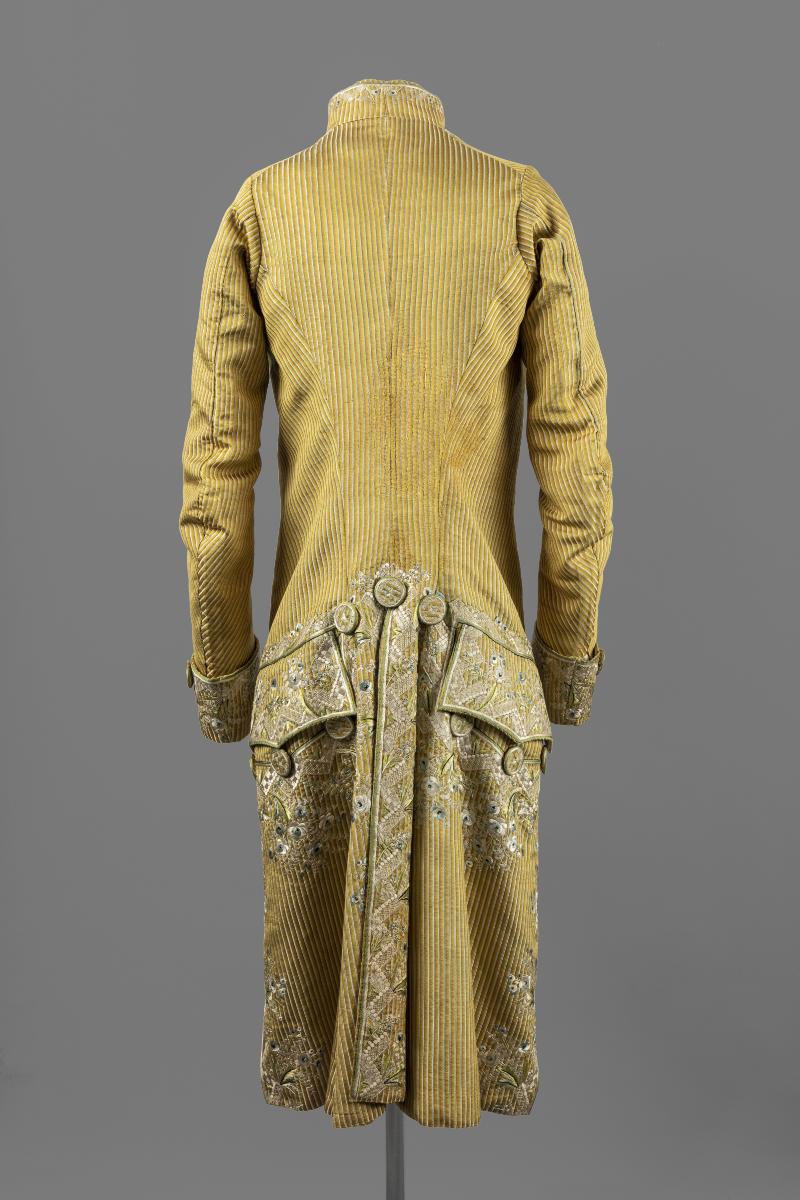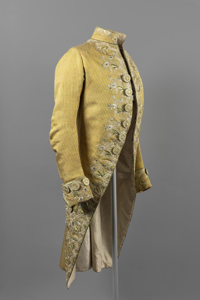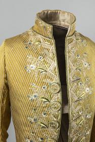 Herrdräkt bestående av en jacka och en byxa. Av siden med ripsartad yta. Ränder av två färger. Dels där varpen skiftar från gult till mörkt gulbrunt inom 4 mm breda ränder och dels 1,5 mm breda ränder med inslagseffekt i ljusblått. Broderier i platt-, schatter-, botten-, langett- och kantsöm med tvinnat och otvinnat silke i gråvitt, ljusblått, grönt, blågrönt samt något svart. Foder av vit taft. Byxor av ljusbrun sidenatlas, foder av bomullslärft. Två klädda knappar vid vardera knä.