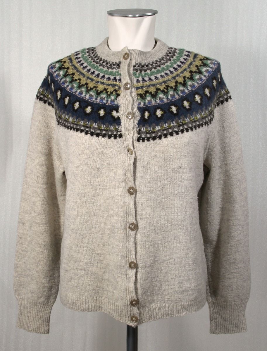 Kofta "Eskimå" i lammull. Naturvitt, (ljus gråmelerad), brunt, gråbrunt, blått, grönt, gult och rosa. Rikt mönstrad, ca 20 cm bred bård upptill på bak- och framstyckena. 9 knappar.