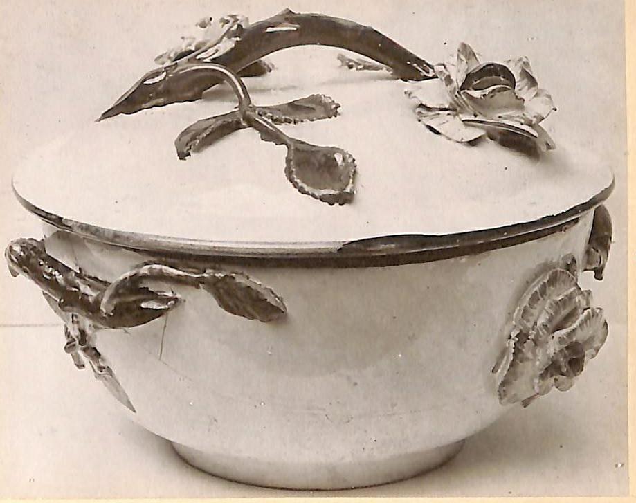 Bonbonjär i glaserad fajans med växtdekor i färger. Framställd under Ehrenreichs period 1758-1766.