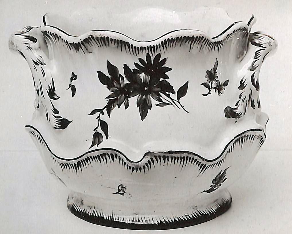 Blomkruka i vitglaserad fajans med målad blomsterdekor i flera färger. Krukan är målad av Gabriel Lindelöf och tillverkad på Marieberg under Ehrenreichs tid 1759-1766.