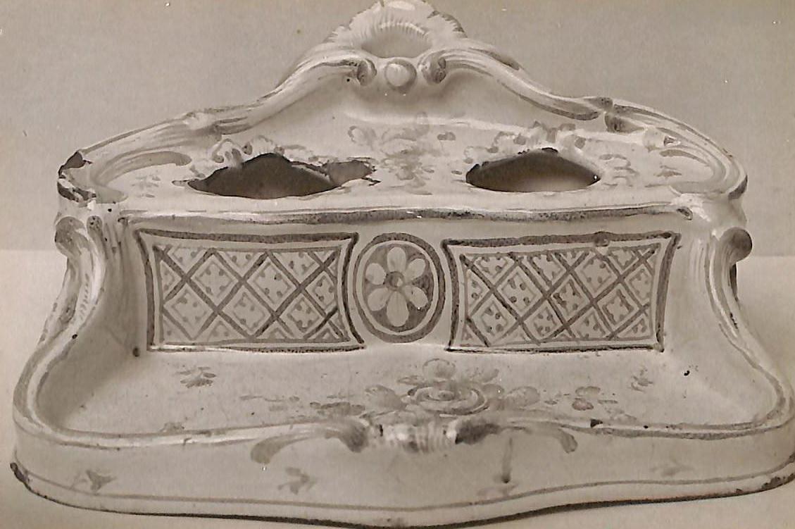 Skrivställ i glaserad och bemålad fajans. Troligen målad av Johan Dahl.