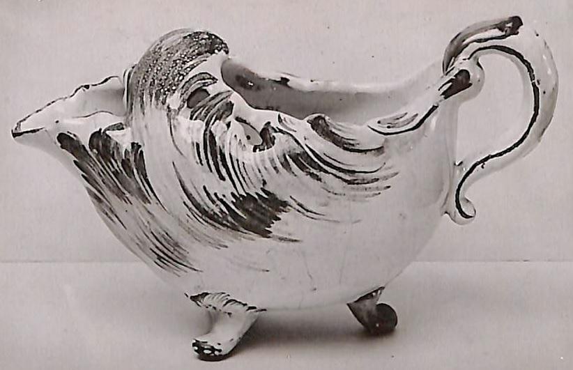 Gräddsnipa i vitglaserad fajans med dekor i violett, grönt och gult. Målad av fajansmålare Johan Dahl.