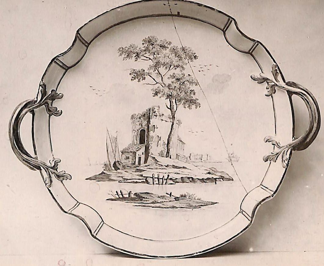 Bricka i glaserad fajans med målad dekor. Landskapsmotiv målat av fajansmålaren Johan Berlin.