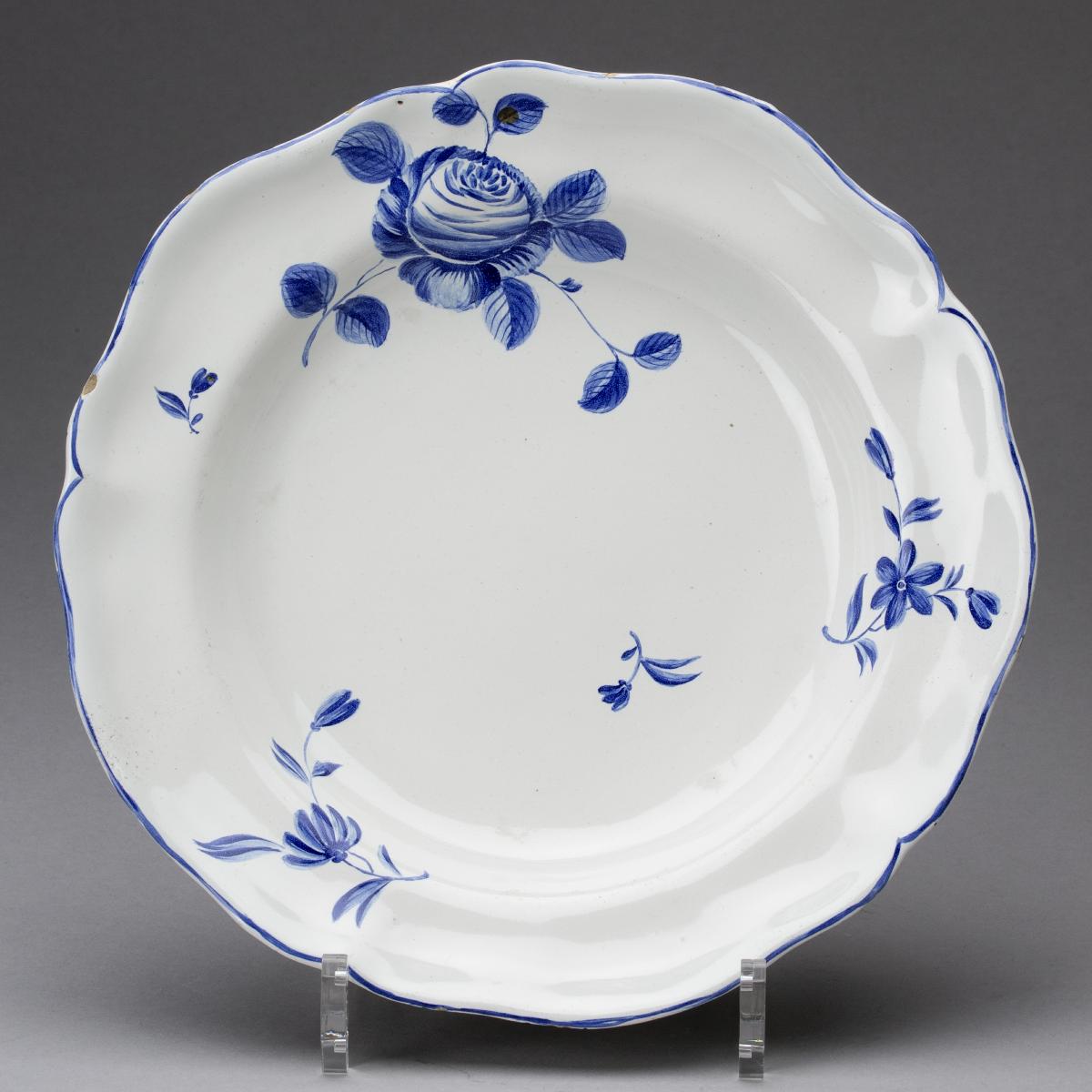 Djup tallrik i vitglaserad fajans med målad dekor. Tillverkad under Ehrenreichs period. Troligen målad av Anders Halldin.