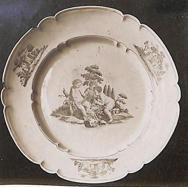 Fat av glaserad fajans med tryckt dekor i sepiabrunt.