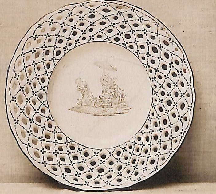 Glaserad fajans. Dekor i sepia och genombruten bräm.