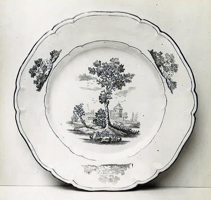 Tallrik i vitglaserad fajans med målad dekor. Framställd av Mariebergs porslinsfabrik under Pierre Berthevins period 1766-1769.