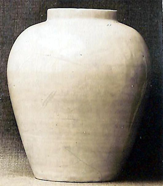 Kruka i vitglaserad fajans. Tillverkad under Pierre Berthevins ledning av Marieberg. Drejad av Conrad Heischman.