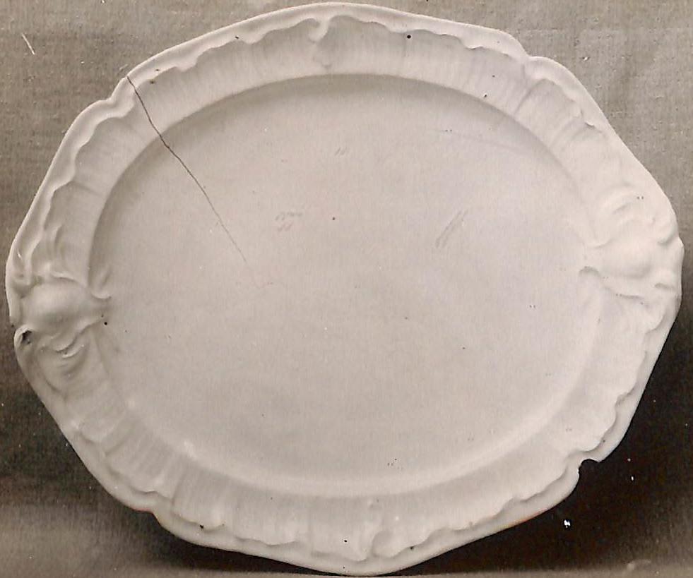 Större fat i vitglaserad fajans. Tillverkat under Ehrenreichs period. Signerad med drejaren Bomkertels signatur.