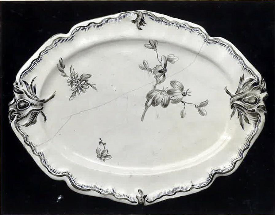 Fat i vitglaserad fajans med dekor i blå camaïeu. Camaïeu är monokrom målningsteknik, det vill säga att man använder sig av endast en färg.