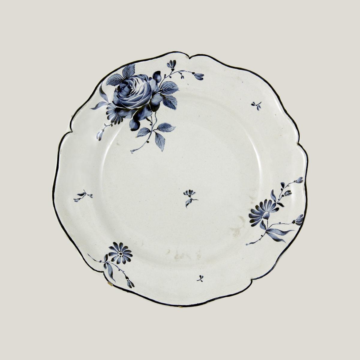 Tallrik i vitglaserad fajans med dekor i blå camaïeu. Camaïeu är monokrom målningsteknik, det vill säga att man använder sig av endast en färg.