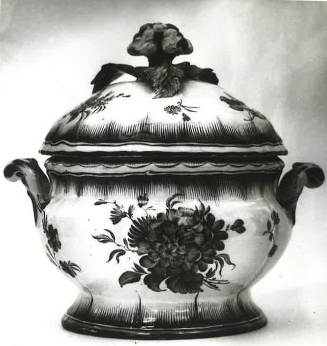 Terrin med lock av glaserad fajans med dekor av strödda blommor och stoffering i blå camaïeu. På locket en knopp av ett blomkålshuvud, omgivet av tre plastiska blad. Utförd vid Mariebergs fajans och porslinsfabrik under Ehrenreichs tid 1758-1766.