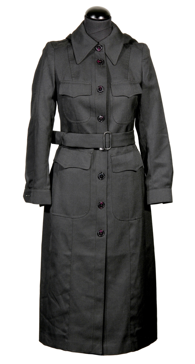 Svart kappa i ull och polyester med kapuschong och skärp.