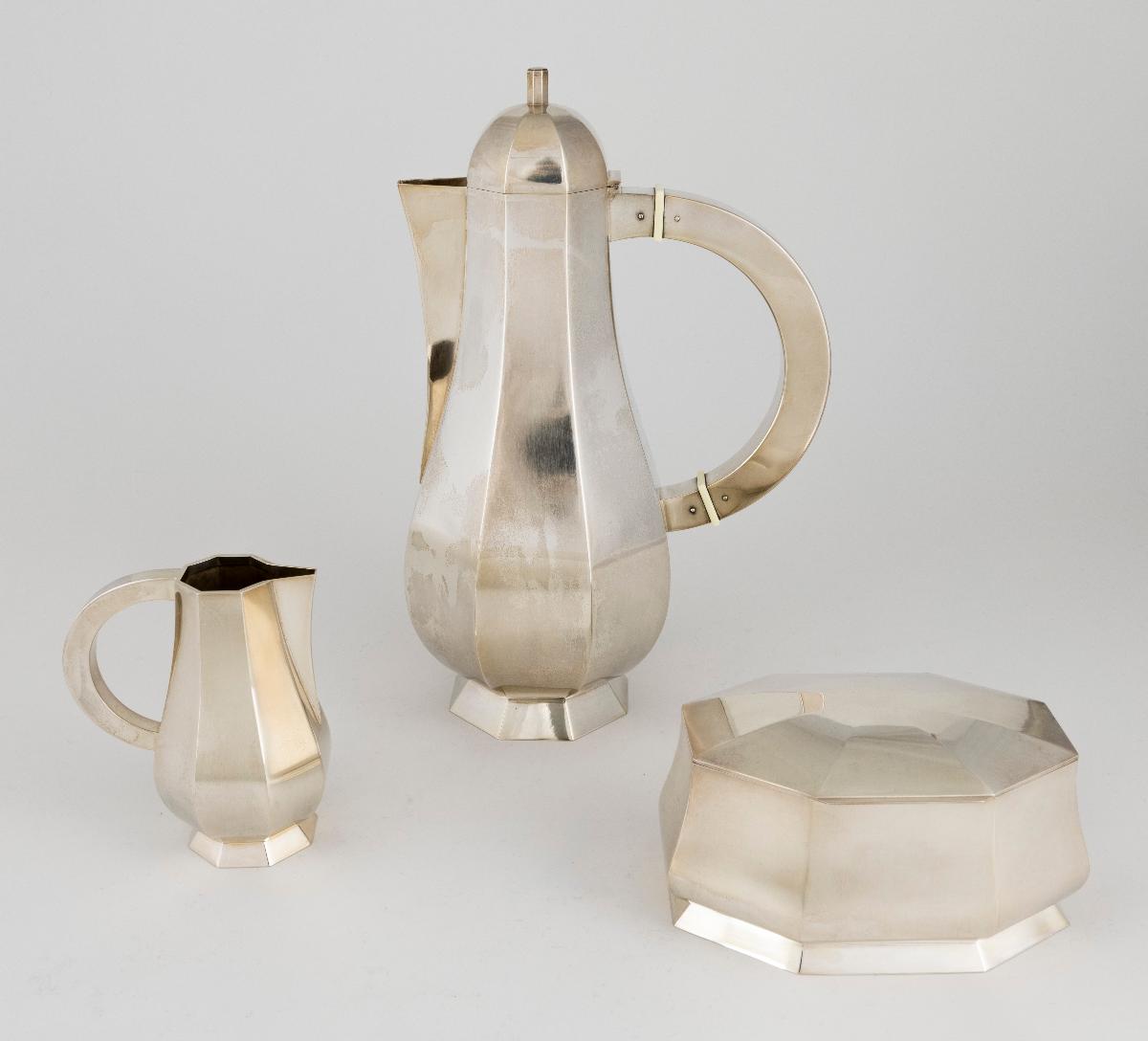 Kaffeservis av silver i tre delar: kaffekanna, sockerskål och gräddkanna.